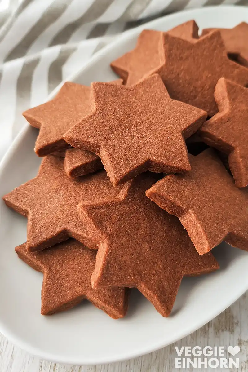 Vegane Schokoplätzchen in Sternform liegen auf einem weißen Plätzchenteller.