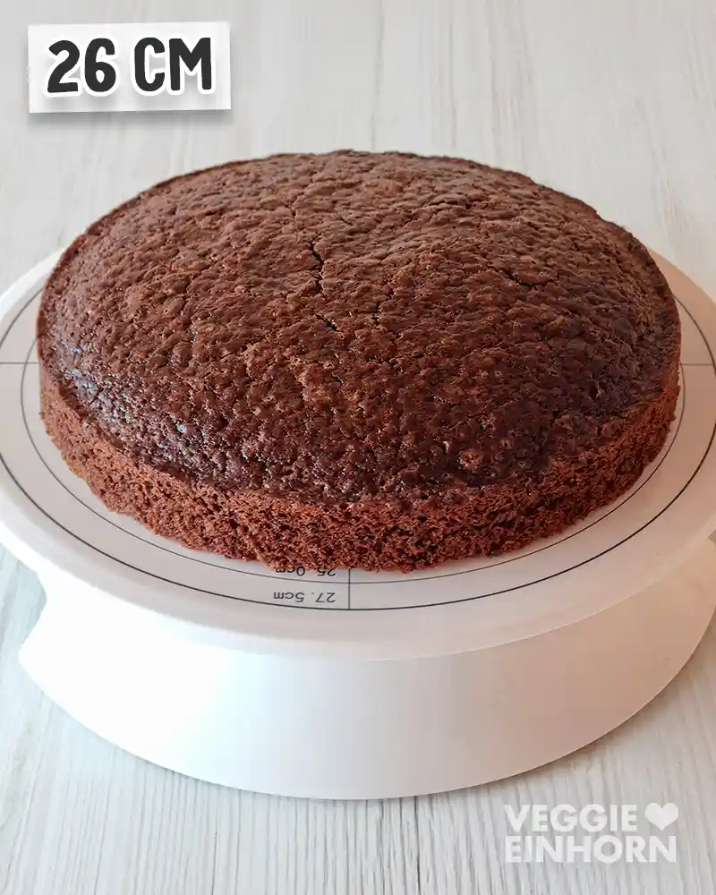 Frisch gebackener veganer Schokobiskuit als runder Tortenboden auf einer Drehplatte.