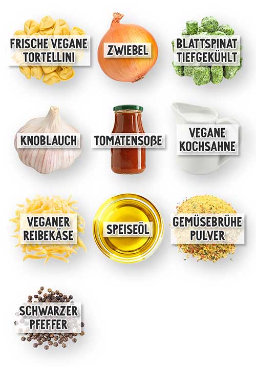 Vegane Tortellini, Spinat und aromatische Tomatensoße ergeben zusammen ein unkompliziertes Ofengericht, das satt und glücklich macht.